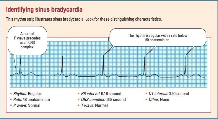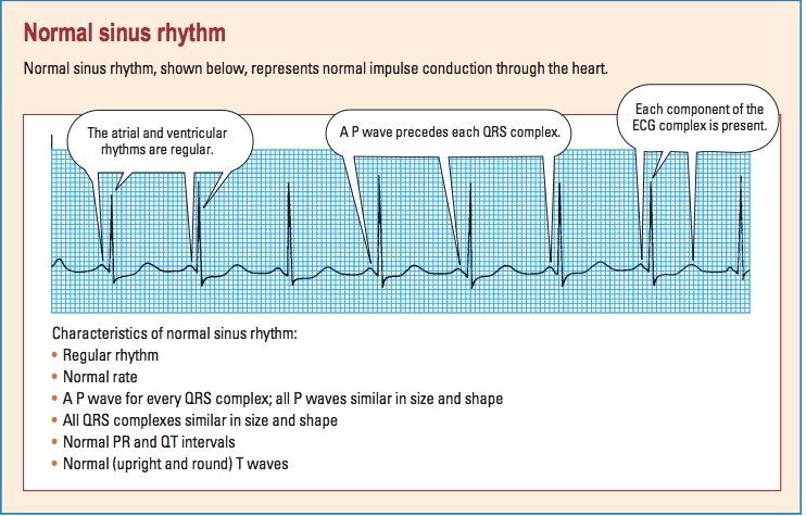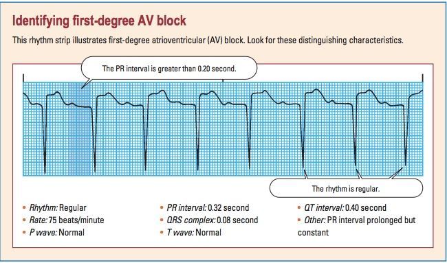 Sinus- extra factsSinus rhythm with first degree heart block: new heart blocks are common after MI; monitor for degrading to 2nd/3rd degree. 60-80bpm. Regular rhythm. Long PR. Normal QRS