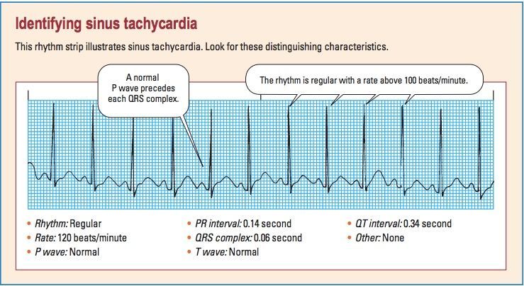 Determine rhythm: compare the distance between R-R intervals to determine is rhythm is regular or irregular Determine the rate: In a six second strip, multiply R peaks by 10. (60 secs in a minute; 15 large boxes in 3 seconds) Evaluate P wave: Are P waves present? Do they all have normal configurations? Do they all have a similar size and shape? Is there one P wave for every QRS complex? Duration of PR interval: To measure the PR interval, count the small squares between the start of the P wave and the start of the QRS complex; then multiply the number of squares by 0.04 second. Now ask yourself: Is the duration a normal 0.12 to 0.20 second? Is the PR interval constant? Determine duration of QRS complex: To calculate duration, count the number of small squares between the beginning and end of the QRS complex and multiply this number by 0.04 second. Then ask yourself: Is the duration a normal 0.06 to 0.10 second? Are all QRS complexes the same size and shape? (If not, measure each one and describe it individually.) Does a QRS complex appear after every P wave? Evaluate T waves: Are T waves present? Do they all have a normal shape? Do they all have a normal amplitude? Do they all have the same amplitude? Do the T waves have the same deflection as the QRS complexes? Determine duration of QT interval: Count the number of small squares between the beginning of the QRS complex and the end of the T wave, where the T wave returns to the baseline. Multiply this number by 0.04 second. Ask yourself: Is the duration a normal 0.36 to 0.44 second? Evaluate any other components: Check for ectopic beats and other abnormalities. Also check the ST segment for abnormalities, and look for the presence of a U wave. Note your findings, and then interpret them by naming the rhythm strip according to one or all of these findings: origin of the rhythm (for example, sinus node, atria, AV node, or ventricles) rate characteristics (for example, bradycardia or tachycardia) rhythm abnormalities (for example, flutter, fibrillation, heart block, escape rhythm, or other arrhythmias).