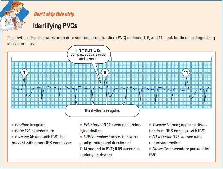 Deciphering PVCs To determine whether the rhythm you’re assessing is a premature ventricular contraction (PVC) or some other beat, ask yourself these questions: Are you seeing ventricular escape beats rather than PVCs? Escape beats act as a safety mechanism to protect the heart from ventricular standstill. The ventricular escape beat will be late, rather than premature. Are you seeing normal beats with aberrant ventricular conduction? Some supraventricular impulses may take an abnormal pathway through the ventricular conduction system, causing the QRS complex to appear abnormal. This aberrantly conducted beat will have a P wave, whereas a PVC doesn’t