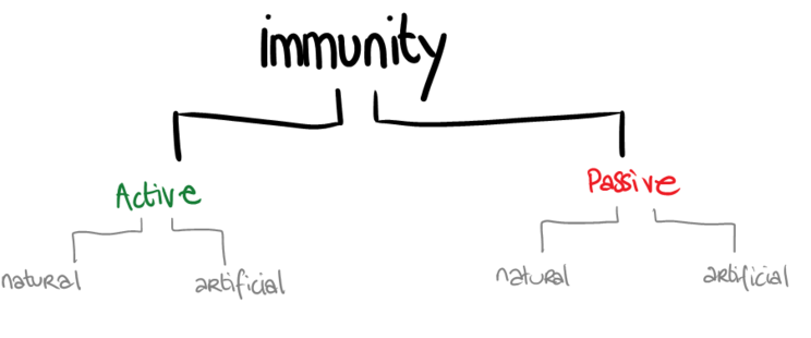A vaccination is given and specific T/B memory cells are activated. 1st clones of memory cells are produced. Boosters are then given to make memory cells divide even more, acquiring immunity.