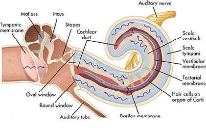 Organ of corti Sense organ of hearing  lies pn the basilar membrane extending from base to apex consist of : Outer hair cell (3 rows) inner hair cells (1 rows) bases and sides of hair cells are surrounded by a network of cochlear nerve ending which lie in the spiral ganglia f(x) of organ of corti : generate nerve impulse when the basilar membrane move in response to sound vibration
