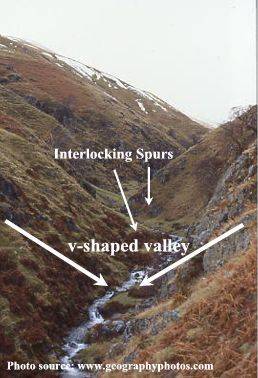 Upper course Sourse: this is were the river starts. It usually starts in the mountains via a stream v- shaped valleys: because the river is at its steepest point the erosion stronger and overtime the river has cut through the rock leaving a steep v-shaped valley.interlocking spurs: these are created when rivers have to flow around an obstacle for instance hard rock. This leaves what looks like snake like stream with the rocks jutting out overlapping.