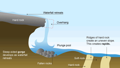 Waterfalls: Waterfalls are formed when soft rock is eroded underneath the hard rock above it. As the rock retracts t leave a hanging cliff. When the hanging cliff is to heavy and gravity overcomes the forces that are keeping it up it falls into a plunge pool. Overtime the process repeats and this leaves a steep sided gorge. rapids: Near waterfalls there is uneven rock types and this creates an uneven surface this intern causes there to be rapids as the water flows over the rock.