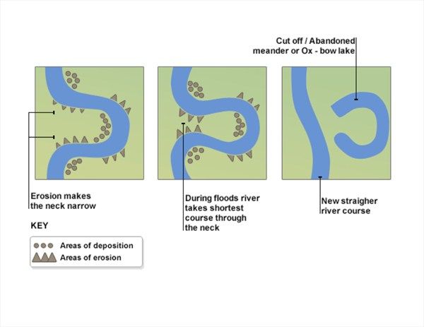 Ox bow lakes a formed by two bends turns in the meander joining together. Due to erosion the two bends will over time come closer together. Then when it flood the river will take its shortest root to the sea and because the neck of the mender is narrow it will flow over the gap in the middle. This causes the river to straighten up leaving the ox and which then dries up.