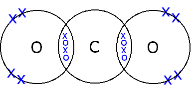 Carbon dioxideCarbon needs four more electrons to fill it upOxygen needs twoSo two double covalent bonds are formed. A double covalent bond has two shared pairs of electrons.