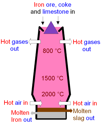 iron can be smelted from iron ore in a simular way to copper. however this requires much more heat. air is blasted through a furnace: a blast furnace