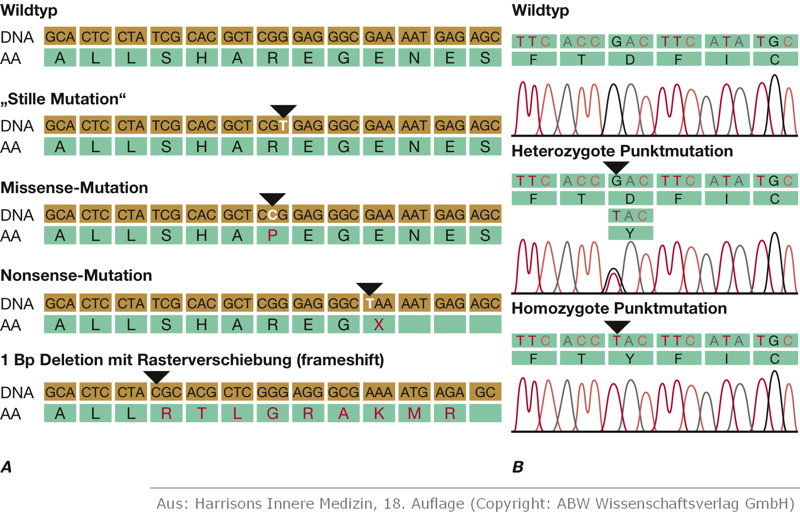 Mutationen -Mutationen=zufällige Veränderungen der genetischen Information-spontan und ungerichtet-Genommutationen= die Anzahl der Chromosomen ist verändert Euploide= ganze Chromosomensätze fehlen oder sind überzählig, in der Pflanzenzucht willkommen:Polyploidie --> Zellen, Gewebe, Früchte sind besonders groß Aneuploide= Einzelne Chromosomen fehlen oder sind überzählig z.B. Down Syndrom/Trisomie 21 (es gibt drei von dem 21. Chromosom) oder Trisomie 18/Edwards Syndrom--> kann zu schweren Fehlbildungen kommen -Chromosomen=der Bau der Chromosomen ist verändert Deletion= Stück eines Chromosom bricht ab: Stückverlust Dublikation=ein Abschnitt ist doppelt vorhanden, ein abgebrochenes Teilstück wächst am homologen Chromosom (2 Chromosomen, die gleich aussehen, Chromosomensatz) fest Translokation= das abgebrochene Teilstück wächst an einem nicht homologen Chromosom an Inversion=Umkehrung eines Chromosomenabschnittes um 180 ° in einem Chromosom, Veränderung Reihenfolge der Gene -Genmutationen=die Struktur einzelner Gene ist verändert Punktmutationen=Austausch Nucleotid und Partner am komplementären Strangstumme Mutation: Mutation im nichtcodierten Bereich eines Gens oder Veränderung des Codons, dieses codiert aber für die gleiche Aminosäure, hat dies keine Auswirkungen auf das ProteinMissense-Mutation: Mutation führt zur Codierung einer "falschen" Aminosäure--> kann Aktivität von Enzymen verändern z.B. SichelzellenanämieNonsense-Mutation: Mutation führt zur Codierung eines Stopp-Codons, Translation endet verfrüht, Polypeptid funktionslos Rastermutation=Leseraster verschiebt sichInsertion=Einfügen einer BaseDelation=Verlust einer Base--> Aktivität Protein verändert sich Ursachen-Replikationsfehler-Fehler bei der Chromosomenverteilung während der Mitose-Fehler bei der Chromosomenverteilung während der Meiose-Mutagene chemische Substanzen (LSD, Agent Orange Senfgas, Spindelfasergift/ Colchitin) physikalische Faktoren (Röntgenstrahlen, radioaktive Strahlung, UV-Strahlung, Temperatur