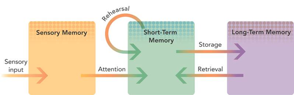 Describe the Atkinson-Shiffrin Theory of memory storage including what type of information and for how long is held in each memory system.The theory is that memory storage involves three separate systems: Sensory memory- holds information from the world in its original sensory form. time frame is of a fraction of a second to several seconds Short-term memory- any type of information. time frame is 30 seconds unless it is rehearsed. Long-term memory- any type of information. time frame is lifetime.