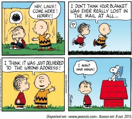 Linus é um menino que adora filosofar e está sempre com seu cobertor. Nesta tirinha, a expressão “I might have known!” evidencia que Linus
