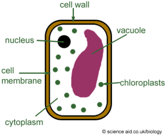 | Vacuole (found only in plant cells) | A sac filled with cell sap and contains sugars, salts and water. When it is full the vacuole supports the cell making it firm. |