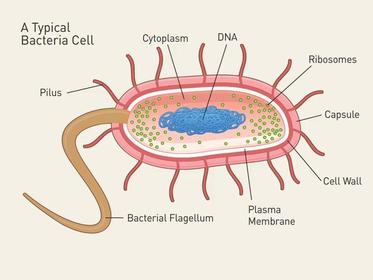 | Bacterial cell | consists of cytoplasm and a membrane surrounded by a cell wall; the genes are not in a distinct nucleus |