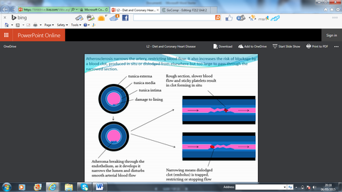 | What happens to the artery wall as more cholesterol becomes deposited? | 1) It becomes less flexible 2) Pushes into the lumen (makes it narrower and restricts blood flow) 3) Makes the surface rough (slows blood flow and increases tendency for blood to clot) |