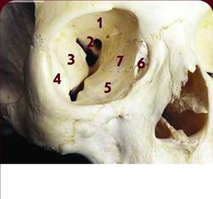 | 1) identify 1 and 7 2) mention structure related to 6 3) mention structure passes through 2 | 1) orbital plate of frontal bone , orbital plate of ethmoid bone 2) lacrimal sac 3) optic nerve and ophtalmic artery |
