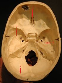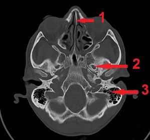 | 1) identify 1,3 2) mention structure pass through 2 | 1) 1- nasal septum 3- mastoid air sinus 2) mandibular nerve |