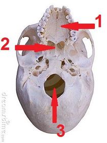 | 1) identify 1 ans 2 2) mention structure related to 3 | 1) hard palate ( palatine process of maxilla) 2) vomer bone 3) lower part of medulla . |