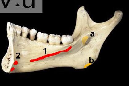 | 1) mention structure attached to 1 2) identify 2 3) structures attached to a and b | 1) mylohyoid muscle 2) genial tubercles 3) a-sphenomadibular ligament b- Medial pterygoid muscle |
