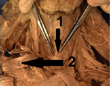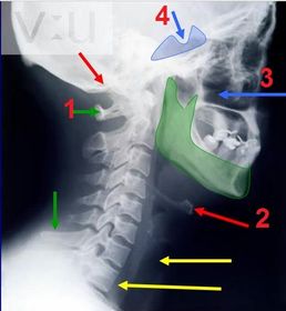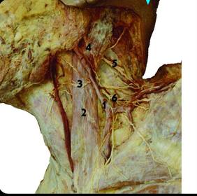 | 1)identify 1,2,3 2) mention structure related to 4 | 1) 1- posterior arch of atlas 2- hyoid bone 3- maxillary air sinus 2) pituitary gland. |