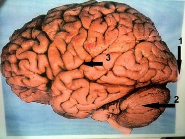 | 1) identify 1 and 2 2) mention structure related | 1) occipital pole, cerebellum 2) middle cerebral artery |