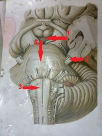 | 1) identify 1,2,3 2) mention structure related to 4 | 1) posterior perforated substance trigeminal nerve pyramid 2) basilar artery |