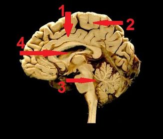| 1) identify | 1- cingulate gyrus 2) paracentral lobule 3) 4th ventricle 4) cavity of lateral ventricle |