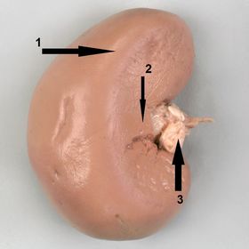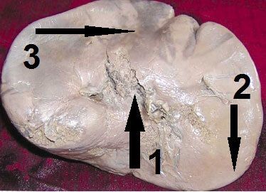 | 1) identify the side 2) mention structures related to 1 and 2 3) identify 3 | 1) right kidney 2) 1- liver (right lobe) 2- 2nd part of dudenum 3) renal vein ( most anterior in position) |