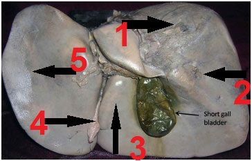 | 1) mention structures related to 2 and 5 2) identify 1, 3 and 4 | 1) 2- right kidney 5- stomach 2)1- bare area of liver 3- quadrate lobe of liver 4- ligamentum teres |