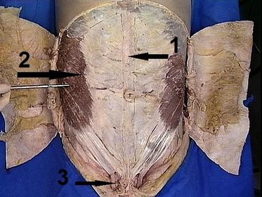 | 1) identify 1,2 and 3 | 1) linea alba 2) external oblique muscle 3) spermatic cord |