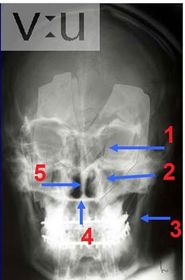 | identify.. | 1) cavity of orbit 2) maxillary air sinus 3) mandibular ramus 4) hard palate 5) nasal septum |
