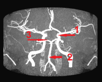 | 1) identify the picture 2) identify 1,2,3 | 1) circle of willis 2) 1- internal carotid artery 2- basilar artery 3- posterior cerebral artery |