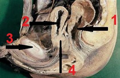 | 1) identify the sex 2) identify 1,2,3,4 | 1) Male 2) 1- rectum 2- urinary bladder 3- symphysis pubis 4- prostate |