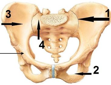 | 1) identify the joint and its type 2) mention structure attached to 2,3 3) identify 4 | 1) 1-sacroiliac joint,plane synovial. 2) 2-obturator membrane 3- iliacus muscle 3) Ala of sacrum |