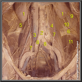 | 1)identify 1 and 2 | 1) isthmus of thyroid gland 2) sternohyoid muscle (cut) |