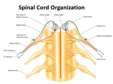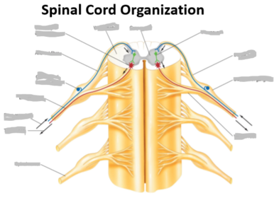 | The spinal cord has __ segments Each segment has a pair of _____ ______ Each spinal nerve consists of a: 1. ___________ root (sensory) 2. _________ root (motor) | 31 spinal nerves dorsal root ventral root |