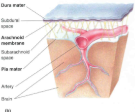 | Meninges - "covering" (greek) What are the 3 meninges that cover the brain? | 1. Dura mater "hard mother" (thick like leather) 2.Arachnoid "spider" (greek) 3. Pia Mater "gentle mother" |