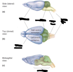 | Major brain divisions: 1. Forebrain - - 2. Midbrain: - - 3. Hindbrain - - | 1. cerebral cortex thalamus (retina) 2. midbrain - tectum (sup. & inf. colliculus) - tegmentum 3. Hindbrain - cerebellum and pons - medulla |