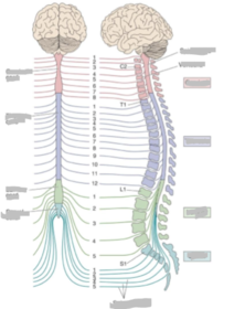| The spinal cord has five regions, with different numbers of spinal segments: 1. 2. 3. 4. 5. | 1. Cervical – 8 2. Thoracic – 12 3. Lumbar – 5 4. Sacral – 5 5. Coccygeal - 1 |