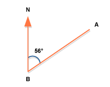 | Example of Bearings: | Find the bearing of A from B: 1) 'From' B 2) Draw a northline @ point B 3) Go clockwise from the N line. This angle is the bearingof A from B. (56) |