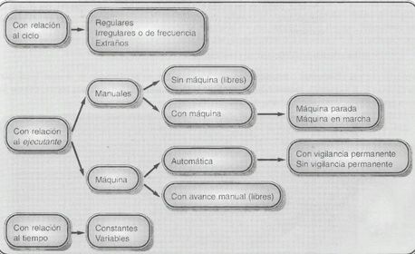 | EN RELACIÓN CON EL EJECUTANTE, LOS ELEMENTOS SE CLASIFICAN EN: 1. Elementos manuales A. Manuales sin maquina B. Manuales con maquina 2. Elementos de maquina A. De maquina con automático. B. De maquina con avance manual | EN RELACIÓN CON EL TIEMPO SE CLASIFICAN EN: 1. Elementos constantes 2. Elementos viables |