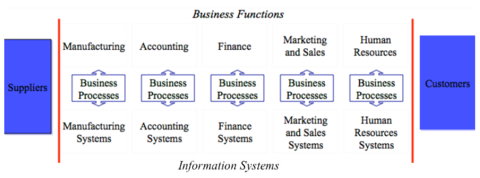 | What are problems relating to Functional Processes and Systems? Name at least 3. | ● Data is duplicated because each functional application has its own database ● Business processes disjointed because supporting applications separated ● Difficult for activities to reconcile data and increases chances of errors ● Lack of integrated enterprise information ● Inefficiency ● Increased costs due to duplicated data, disjointed systems, limited information, and inefficiencies. |