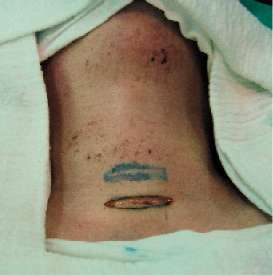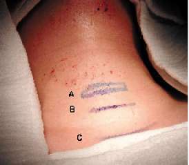 | procedimiento El procedimiento debe ser realizada en pabellón. - Idealmente con anestesia general; en caso de no ser posible y tener que recurrir a la anestesia local siempre se debe contar con la asistencia de un anestesiólogo. - Paciente en decúbito dorsal y cuello en extensión | Incisión transversal o levemente arciforme de suave concavidad superior, de alrededor de 4 cm de longitud, a un dedo por debajo del borde inferior del cartílago cricoides . |