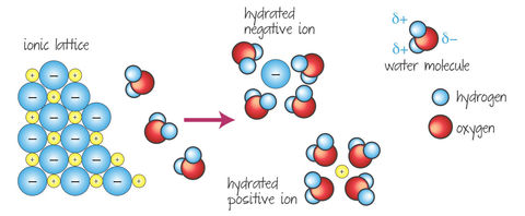 | Explain how ions become hydrated (Hint: refer to polarity and water ions) | Water molecules are polar as there is some separation of charge in their structure - note the ð+ and δ- charges on the water molecules. This polarisation occurs, because oxygen is more electronegative than hydrogen. At the surface of the crystal, where it is in contact with the water solvent, the partial charges in the water molecules are attracted to the oppositely charged ions in the lattice. This results in the ions being dislodged from their position. These ions break off from the lattice, becoming surrounded by water molecules. The ions become hydrated - surrounded by a hydration shell of water molecules. When this happens, the solid dissolves. |