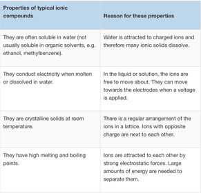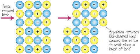 | Why are ionic compounds usually brittle? | movement of the ions within the lattice, places ions of the same charge next to/alongsid each other and the repulsive forces cause it to split. |