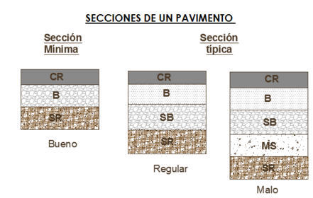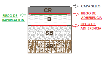 | Materiales a utilizar para las capas: CP-> Agregados + asfalto (piedra picada, arrocillo, polvillo, cemento) SB-> material granular de origen natural B-> Material estabilizado con cal, cemento o asfalto. MS-> Material de préstamo | Riegos-> asfalto diluidos Capa sello-> asfalto diluido + agregados + emulsión Cuando el material utilizado es muy angular, es necesario combinarlo con material granular para que haya mas fricción, y con respecto a la adherencia combinarlo con un material fino. |