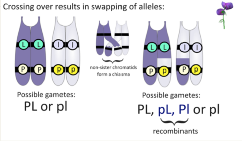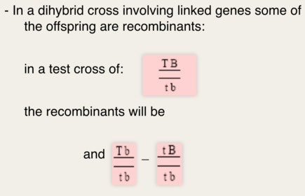 | Recombination | Recombination can occur in chromosomes with linked genes via. crossing-over Example: Parental gametes = PL and pl After crossing-over occurs, 4 different types of gametes are formed (PL, Pl, pL, pl) -> Pl and pL = recombinants (that vary from parental gametes) -> relatively few in # Recombination = offspring whose genotype and phenotype are different from their parents |