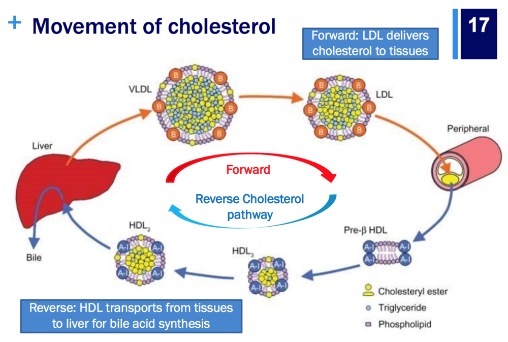 | Explain the endogenous & exogenous cholesterol sources & pathways including the ‘reverse transport’ of cholesterol liver makes cholesterol (de novo) - (endogenous) and we consume it in non plant based food in our diets (exogenous) | |