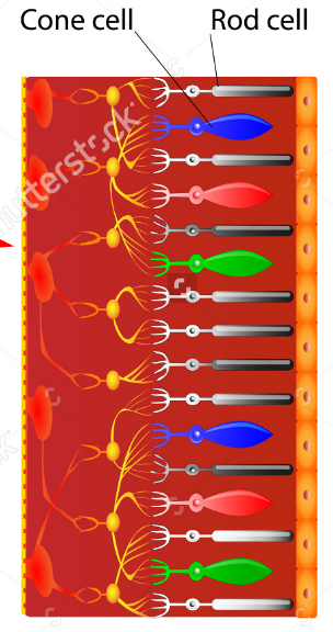 | Comparing rods and cones: Types of rod | - Cones have 3 types of cells, as compared to 1 type of cell for rods - Allows red, blue and yellow vision |