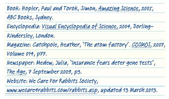 | True or False: Data can be trusted as accurate from scientific text books or encyclopedias but can't be trusted from magazines such as New Scientist or COSMOS. | False Both can be accurate and reliable sources of data but magazines such as New Scientist or COSMOS can be newer sources than encyclopedias or scientific textbooks. |