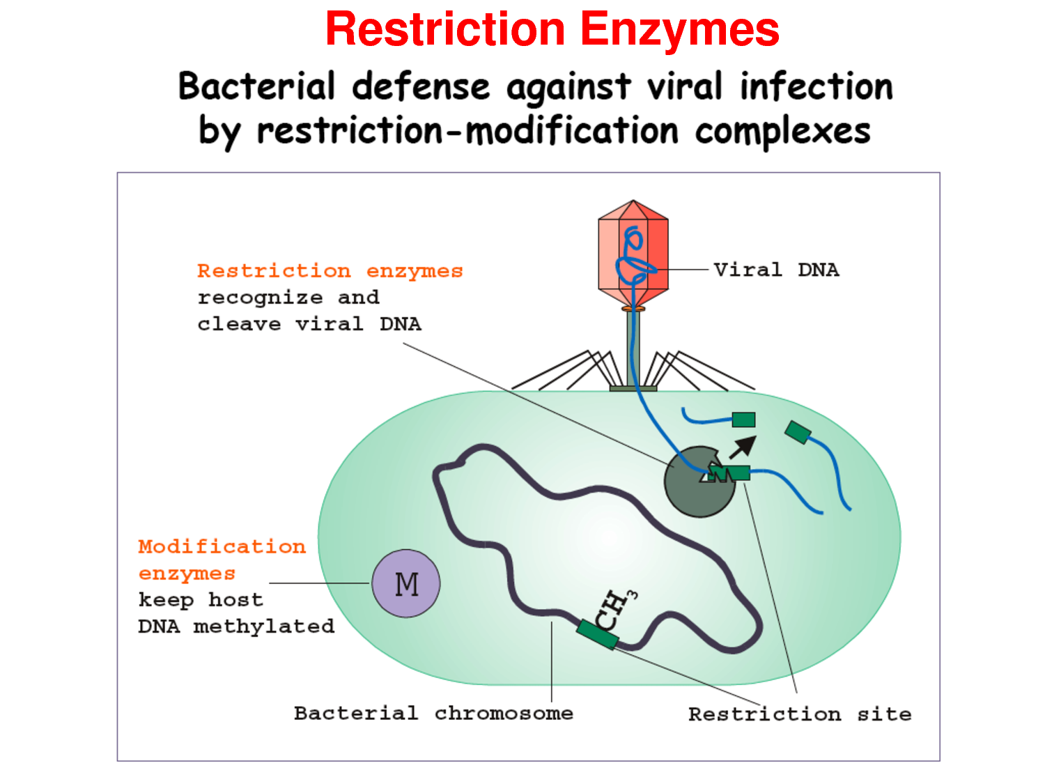 1. Immune Systems: When bacteriophage (virus) injects DNA into bacterial cell, the restriction enzyme breaks foreign DNA into segments and renders it useless.