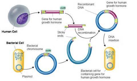 1. Restriction Enzyme cuts specific DNA sequence and is added to another DNA gene in a plasmid. The plasmid can then be injected into a bacterial cell and reproduce more genes, known as “recombinant DNA.”