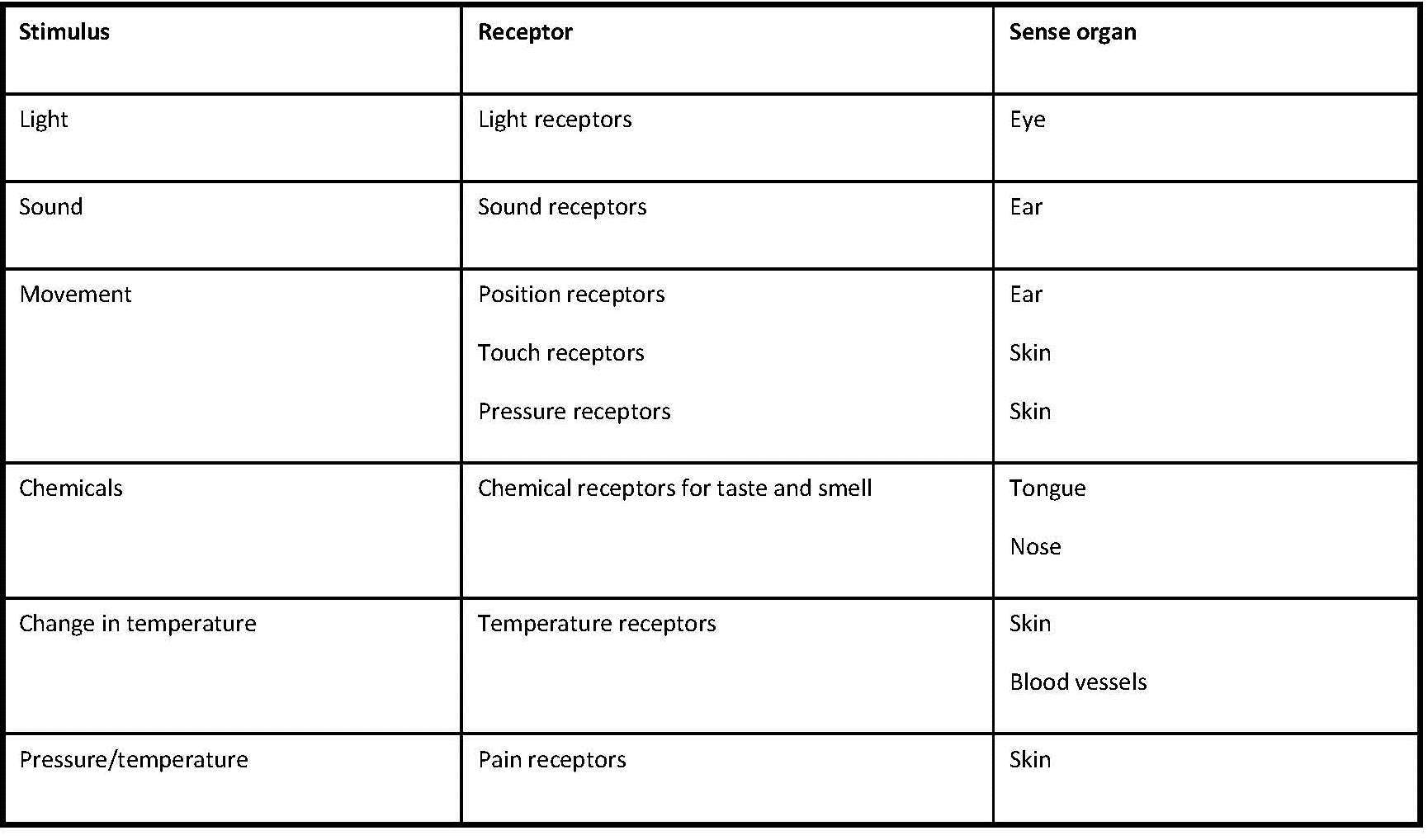 RECEPTORS and STIMULI they can detect: